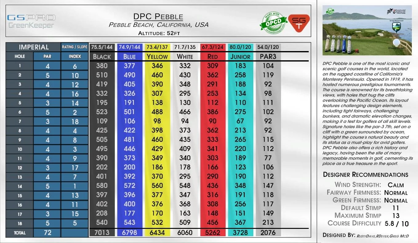 week 5-6: Feb 1-14 DPC Pebble May 28 Written By Bruce G course informaCourse Rating / Slope (White Tees): 71.7 / 135 Front 9 Par: 36 Front 9 Yardage (approx.): 3,426 yardstion Click on the picture for a course Fly-Over Bruce G